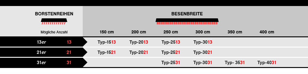 Die Anzahl der Borstenreihen, sowie ihre Anordnung, sind frei wählbar. Die Borsten sind anpassbar an verschiedene Anforderungen. Unsere Besenschmiede berät sie da gern.